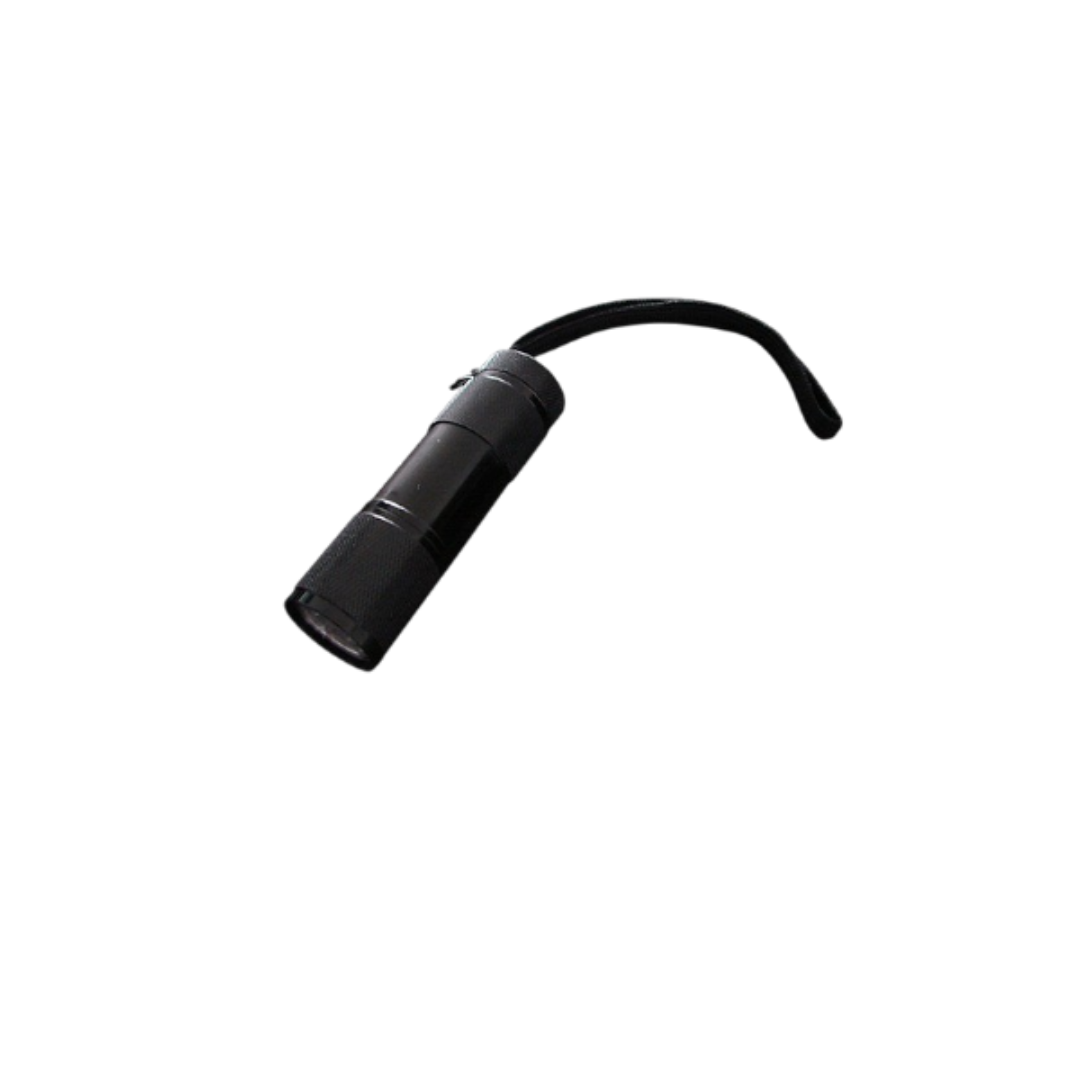 Descripción: Mini Linterna metálica con 9 led´s y correa, swich on-off recubierto de goma. Requiere 3 pilas AAA.