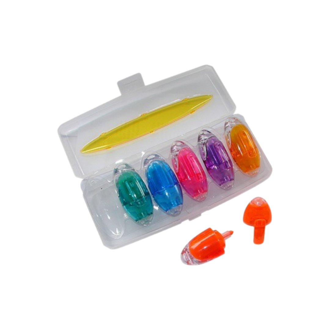 Descripción: Set de seis resaltadores incertados en un termoformado con su caja contenedora de PVC con ventana oval en amarillo traslucido y cierre.