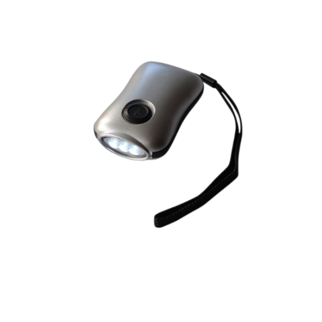 Descripción: Botón de encendido y apagado, manivela rotativa para su carga y correa. Caja contenedora de cartón blanco.