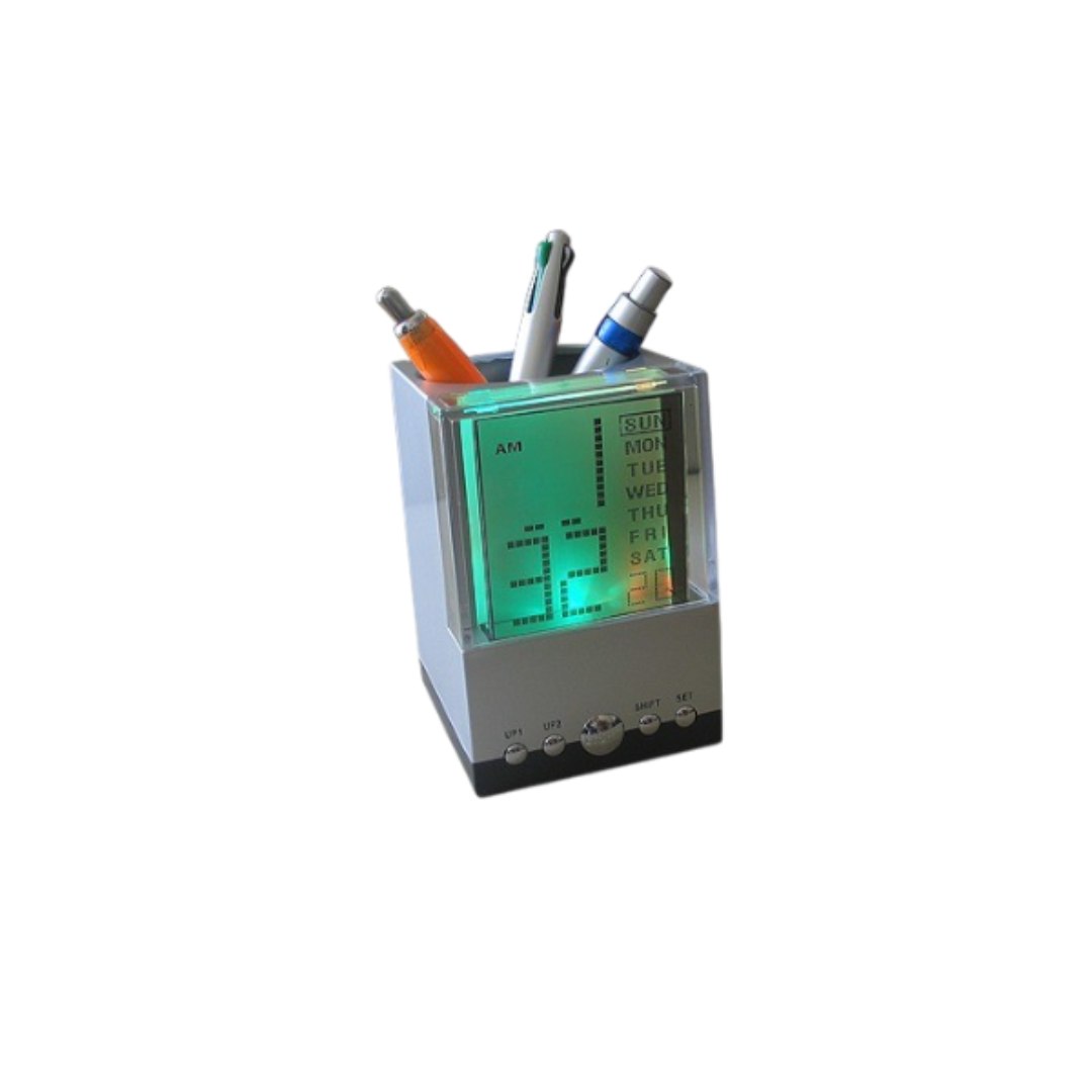 Portalápiz con hora, fecha, temperatura y alarma pantalla fullcolor.