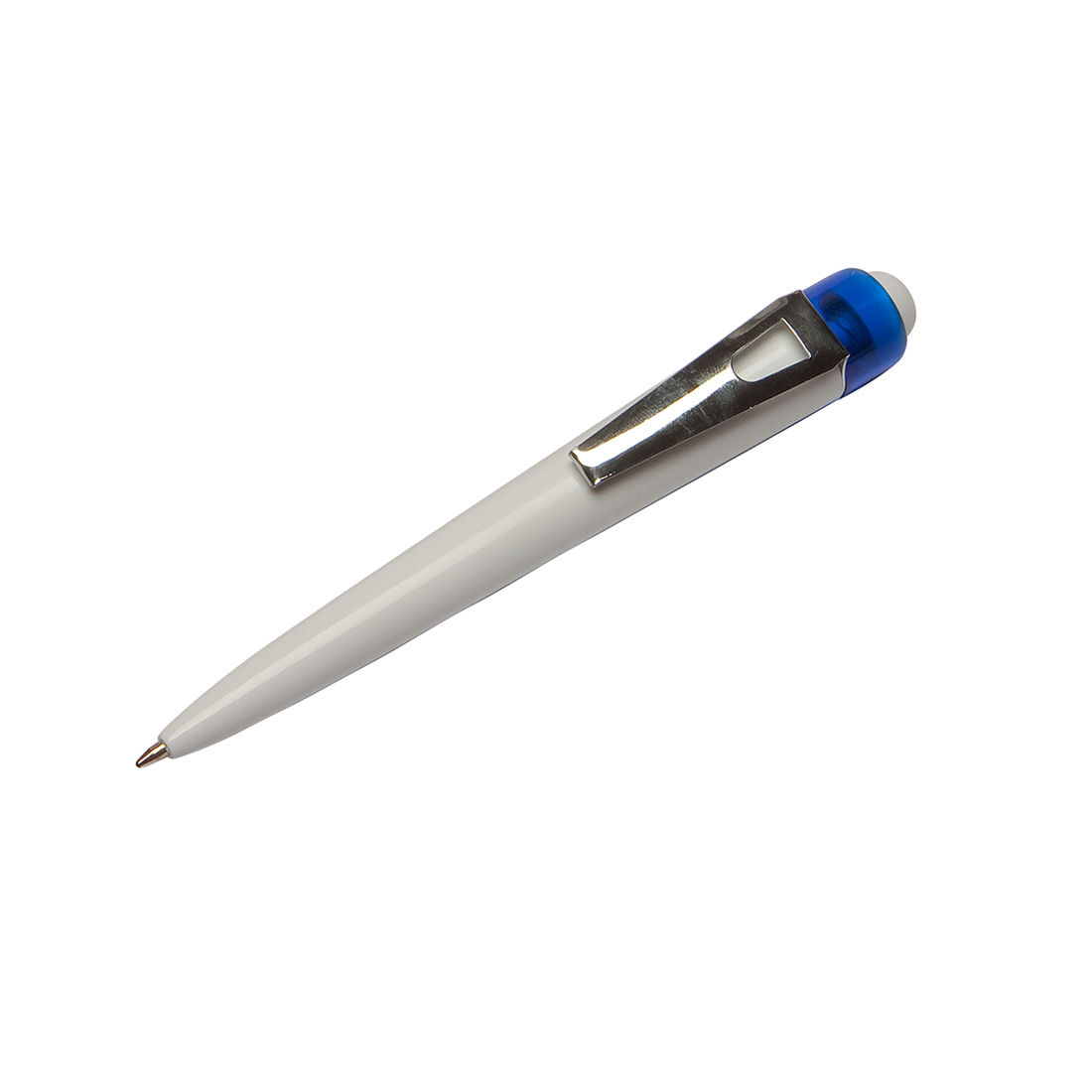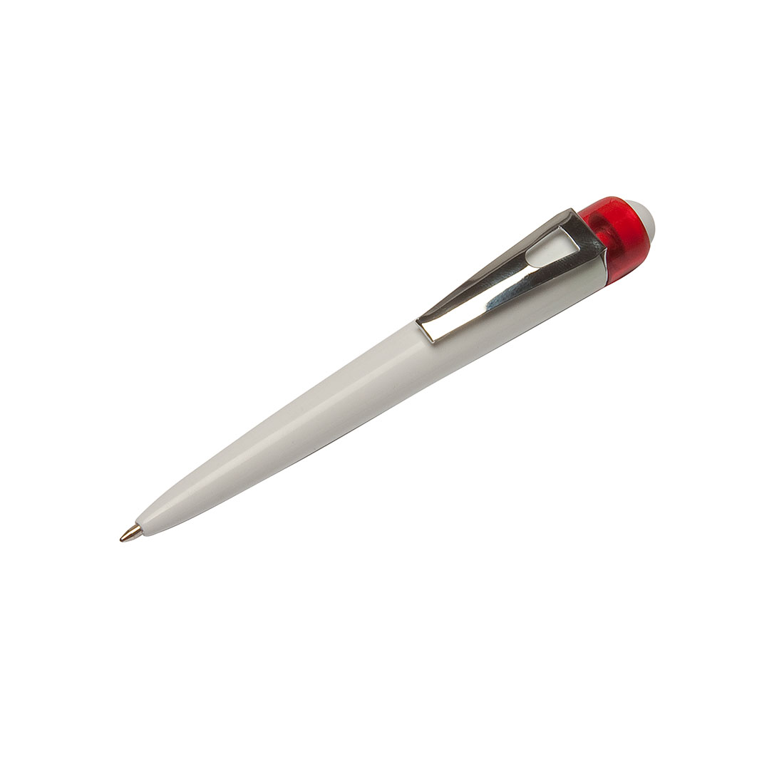 Bolígrafo plástico de cuerpo blanco sólido. Retráctil, con detalle plástico de color. Clip metálico. Tinta negra. Zecat