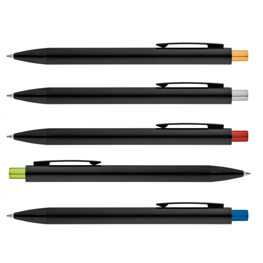 Bolígrafo metálico retráctil con cuerpo negro acabado mate, clic de color metalizado al igual que el fondo del cuerpo cuando se realiza grabado láser. Tinta Azul.