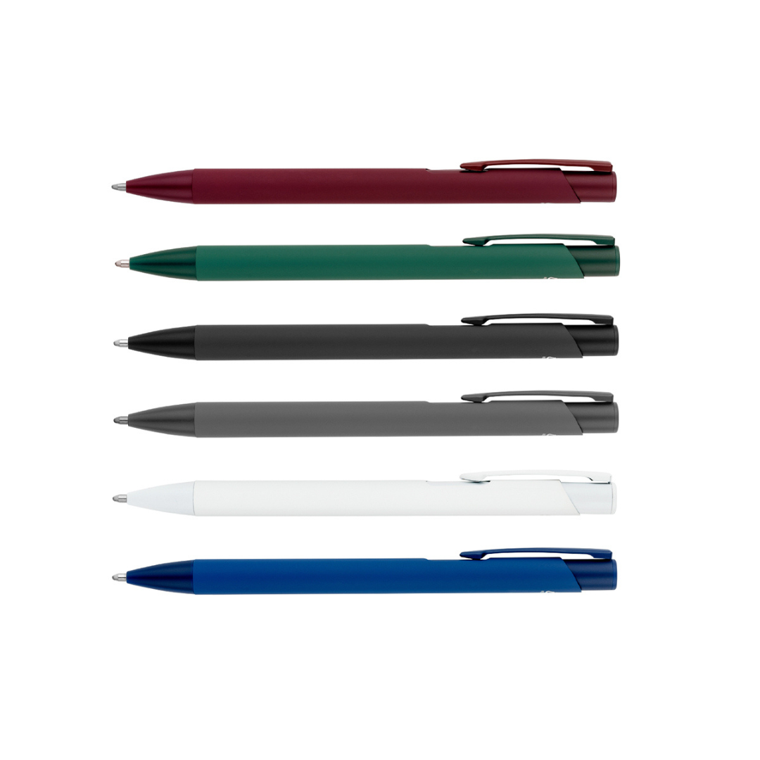 Retráctil, con cuerpo de aluminio 100% reciclado (rAL) y acabado soft-touch tipo engomado. Elegante, sustentable y cómodo para escribir. Tinta: Azul