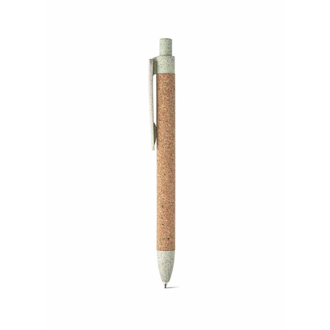 Bolígrafo retráctil ecológico fabricado en fibra de paja de trigo y corcho. Detalles granulados en el color. Tinta azul punta redonda, grosor 1.0MM. Medidas: ø1,1 x 14 cm.