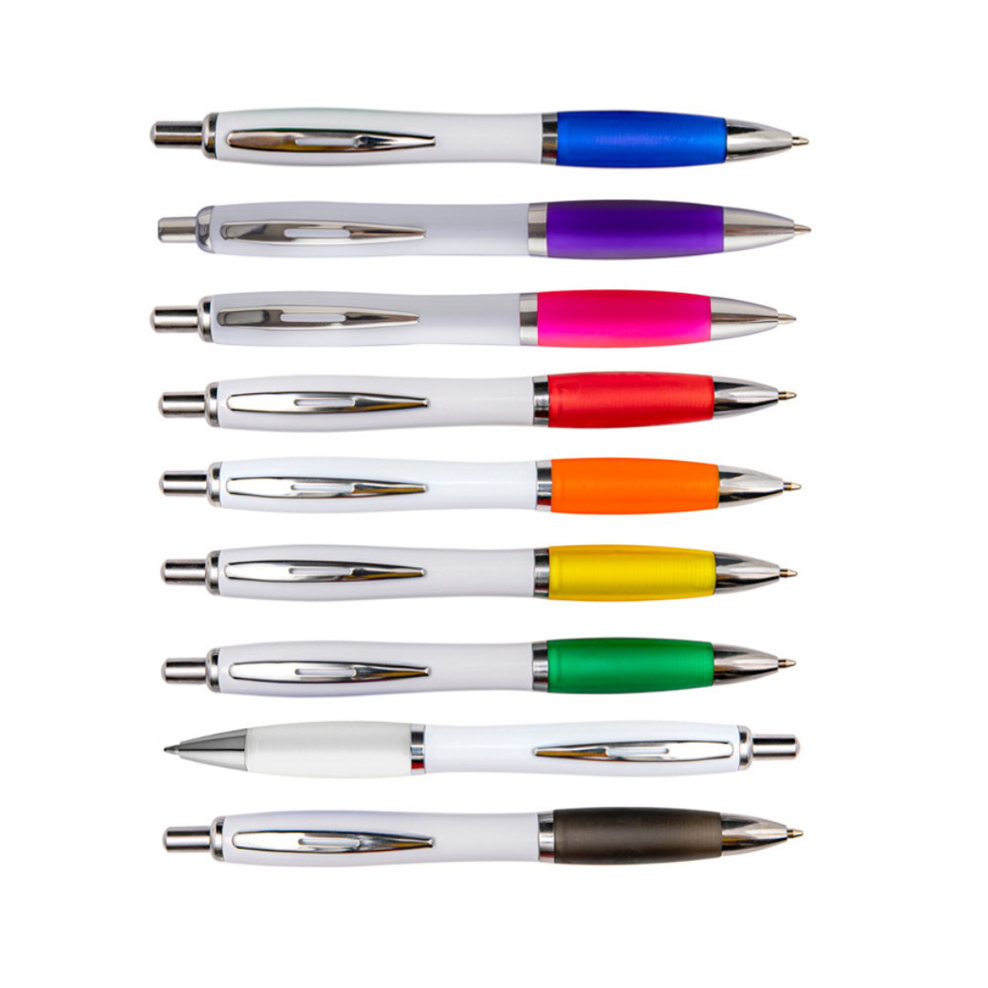 Bolígrafo plástico retráctil con grip de silicona en variedad de colores y clip metálico