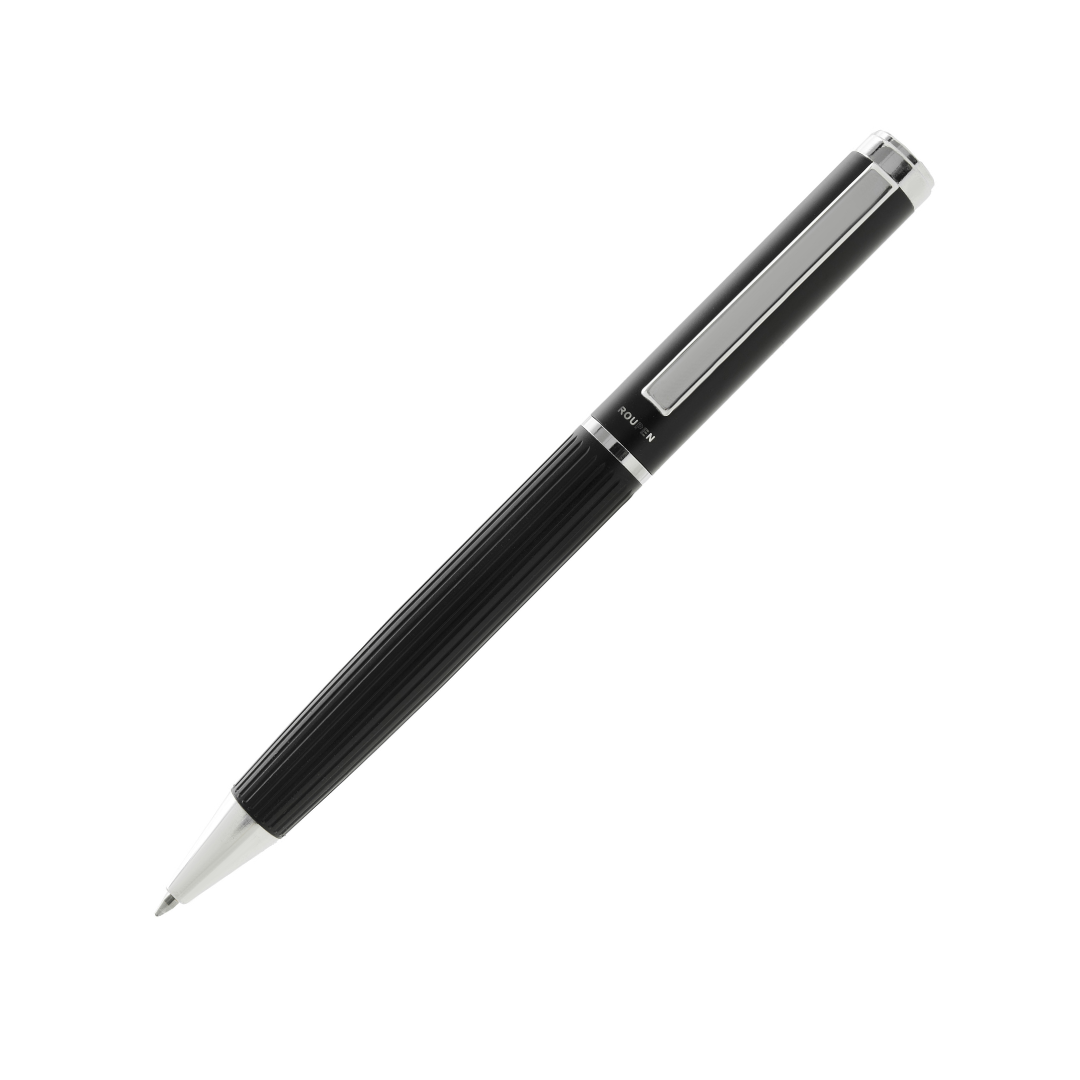 Bolígrafo de cuerpo metálico en acero con detalles en negro. Cuenta con tinta azul y apertura con medio giro. Medidas: 13,8 x 1,3 cm.