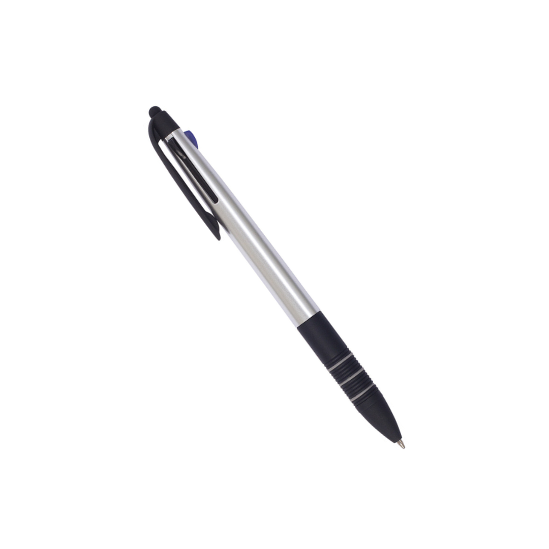 Plástico. Cuerpo plateado. Bolígrafo touch. Con clip y puntera en color negro con detalles en el grip. Tinta azul-roja-negro