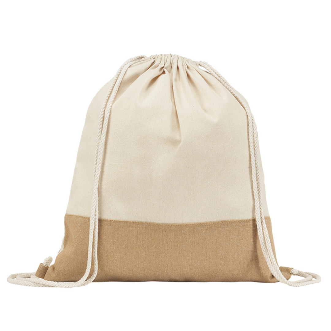 Bolsa tipo mochila de algodón 100% (160 g/m²) con franja en arpillera y cordón de cierre de algodón.