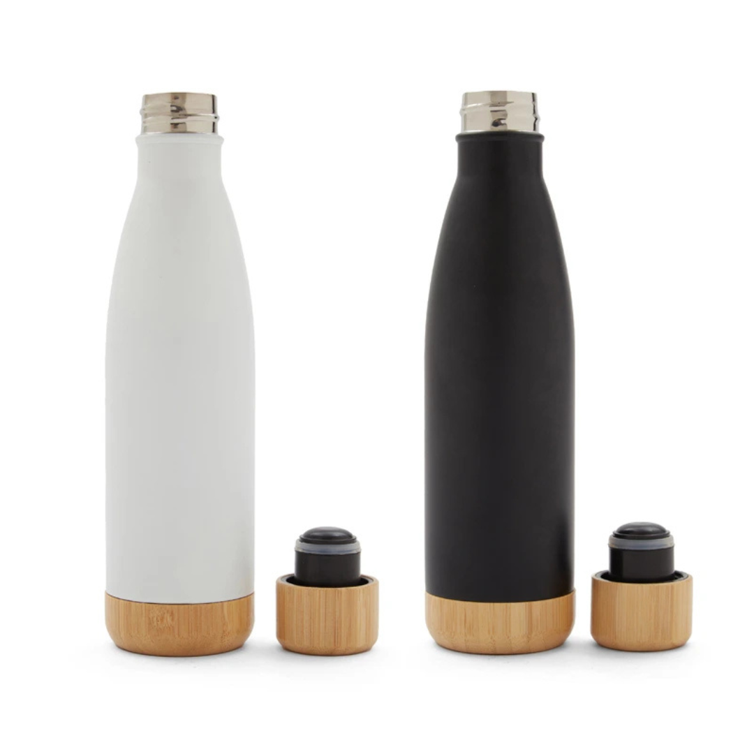 Botella térmica de doble pared de acero inoxidable y tapa de bambú con capacidad de 500 ml. Mantiene las bebidas frías por 24 horas y calientes durante 12 horas. Ideal para deporte o uso diario.