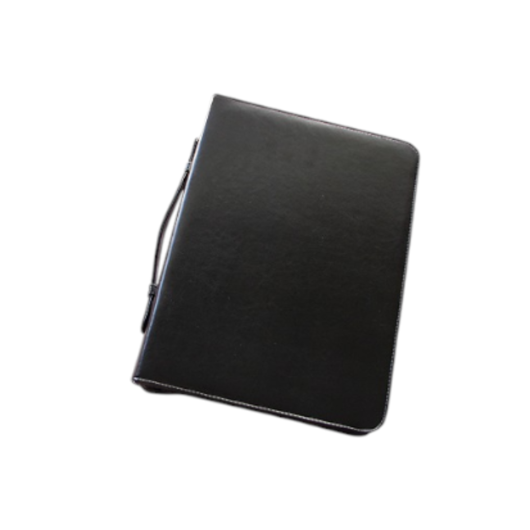 Descripción: Portfolio simil cuero con ganchos, contiene block de hojas y bolígrafo.