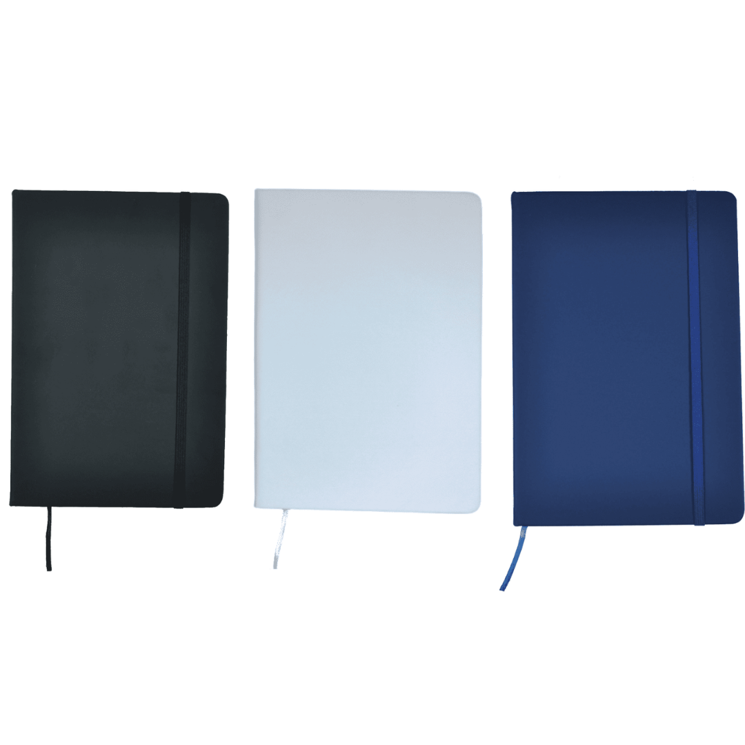 Cuaderno de tapas duras forrado en simil cuero. Posee 100 hojas rayadas, banda elástica de sujección al tono y cinta señaladora.