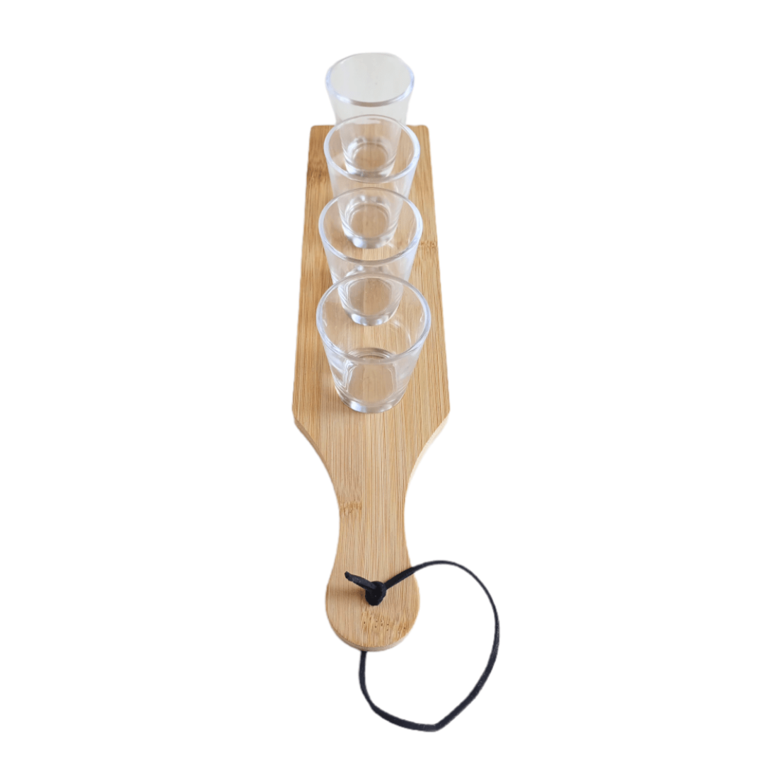 Compuesto por una base de bamboo y 4 shots de vidrio.