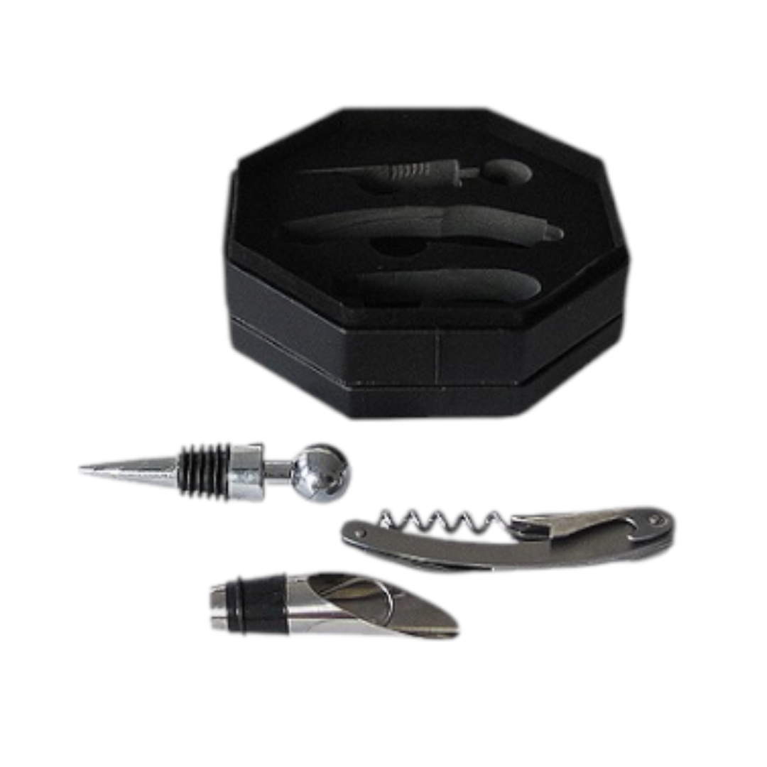 Tres piezas en caja de simil cuero octogonal, contiene un destapador metálico, un tapón metálico y pico vertedor.