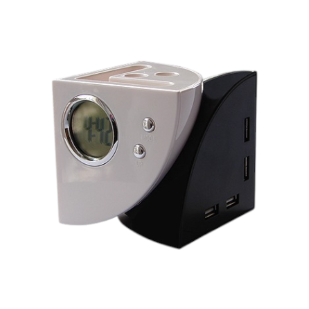 Descripción: Reloj, posee 4 puertos USB 2.0, reloj, calendario y alarma, incluye pila tipo botón y cable USB.
