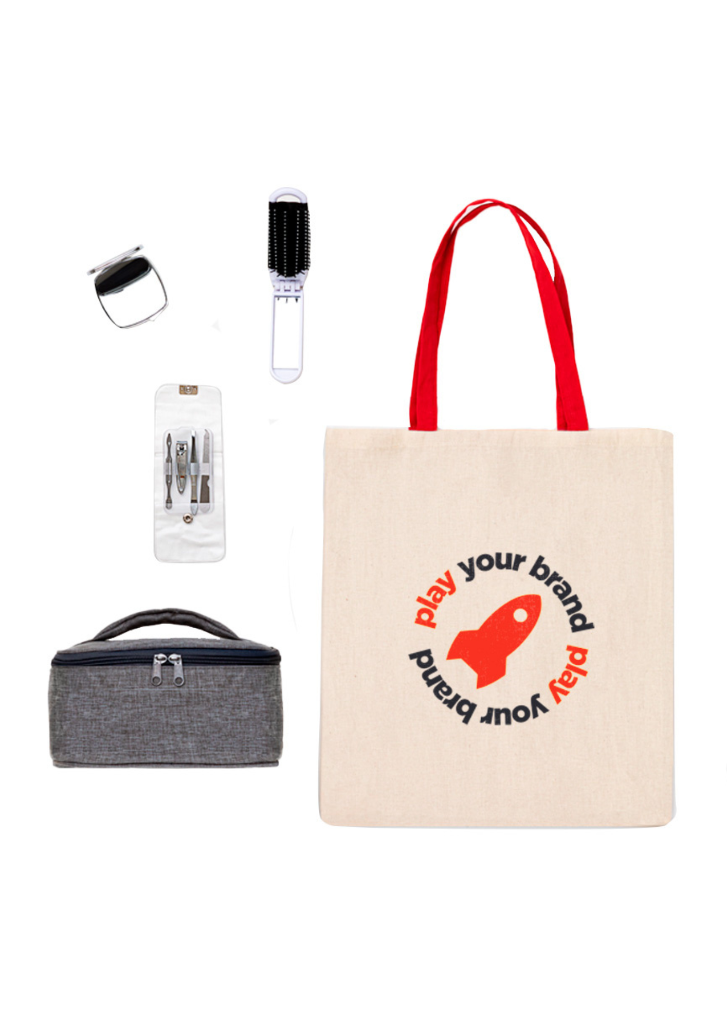Compuesto por: 1 Espejo Cork + 1 Set Manicura + 1 Necessaire Elite + 1 Bolsa String Arpillera + 1 Botella Aluminio Eco Daily