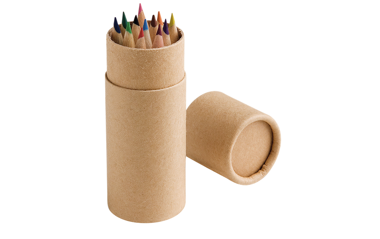 Caja de cartón cilíndrica con 12 lápices mini de colores para pintar.