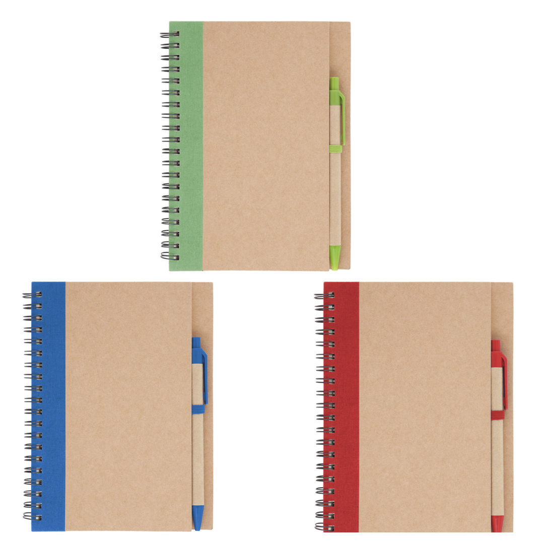 13,8 x 18 x 1,5 cm Elaborada con papel reciclado. Incluye bolígrafo biodegradable. Espiralado. Contiene 70 hojas lisas.