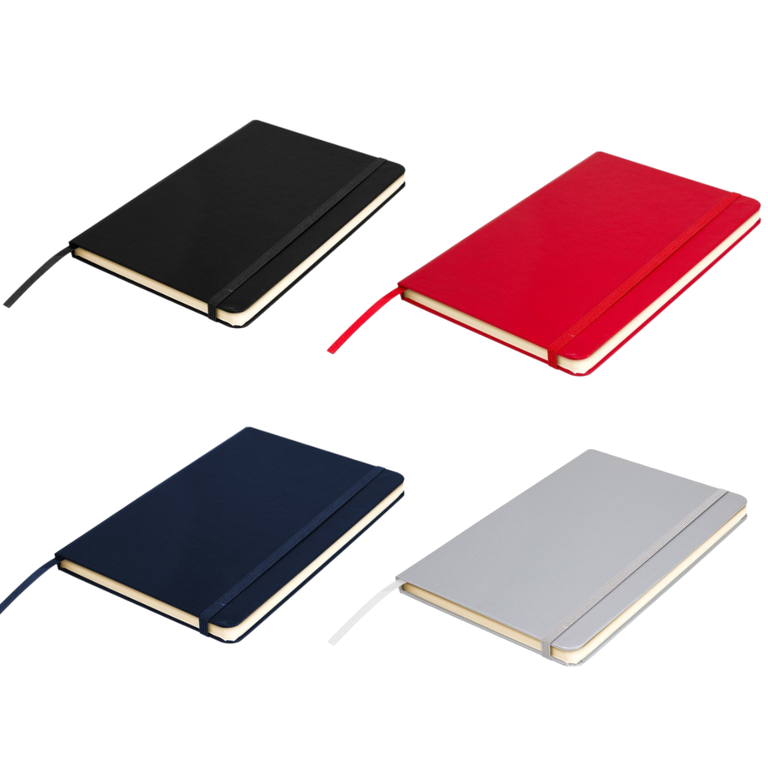 Mantén tus ideas organizadas.Libreta. Tapa de cartón de 300g recubierta en poliuretano de diferentes colores. Interior de 80 hojas rayadas en papel obra crema de 70g. Encuadernación cosida. Incluye cinta señaladora del color de la tapa. Cierre con banda elástica del mismo color.Medidas: 14 x 21 x 1,5 cm.