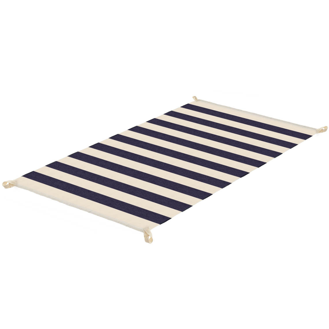 Lona rústica tejida rayada, con flecos. Diseñada para enrollarse con su cinta y poder trasportarla fácilmente.