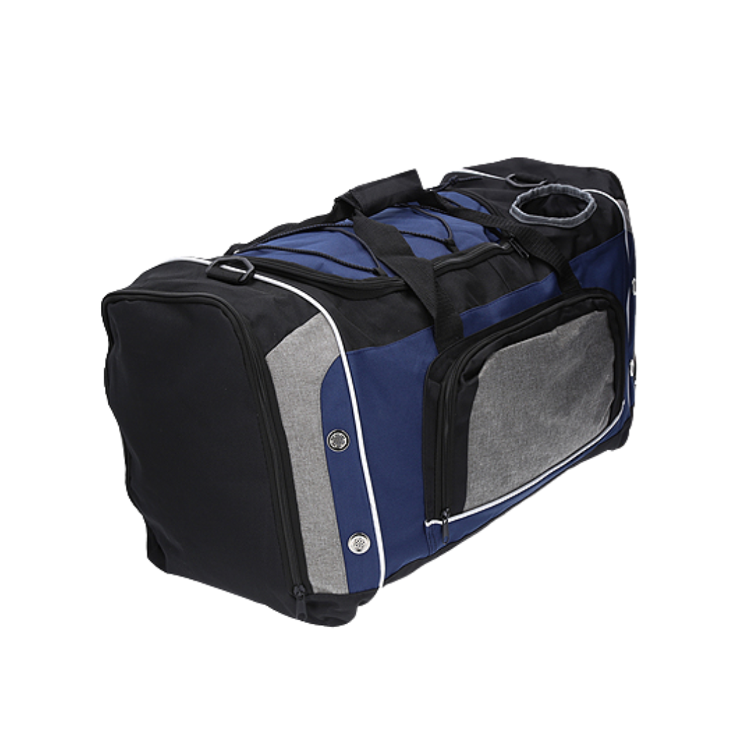 Descripción: Bolso deportivo. Boca principal en parte superior con cierre doble, la misma posee detalle en cinta elástica con mosquetón de ajuste para el trasporte de objetos. En la parte superior incluye un porta botella/jarro con su cinta de ajuste. Bolsillo frontal y compartimentos laterales externos con cierre, los laterales incluyen respiraderos para que se puedan utilizar a modo de botineros. Cierres metálicos. Correa regulable y desmontable. Manijas reforzadas con velcro.