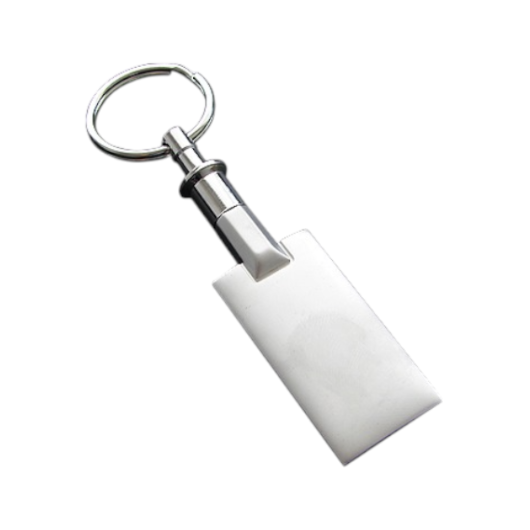 Llavero de Metal Rectangular Descripción: Llavero metálico rectangular con anillo extraíble. Con estuche de cartón negro. Dimensiones: 8 cm x 2.3 cm.