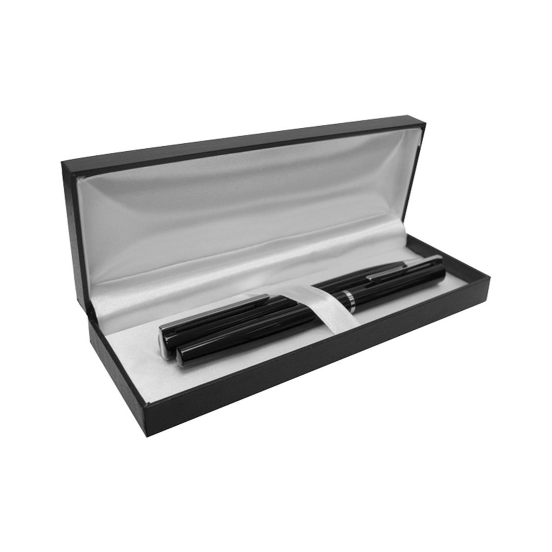 Metal. bolígrafo y Roller Ball, cuerpo de color. Clip, puntera y detalle plateados. Incluye estuche doble. Destape electro plateado en la parte superior.