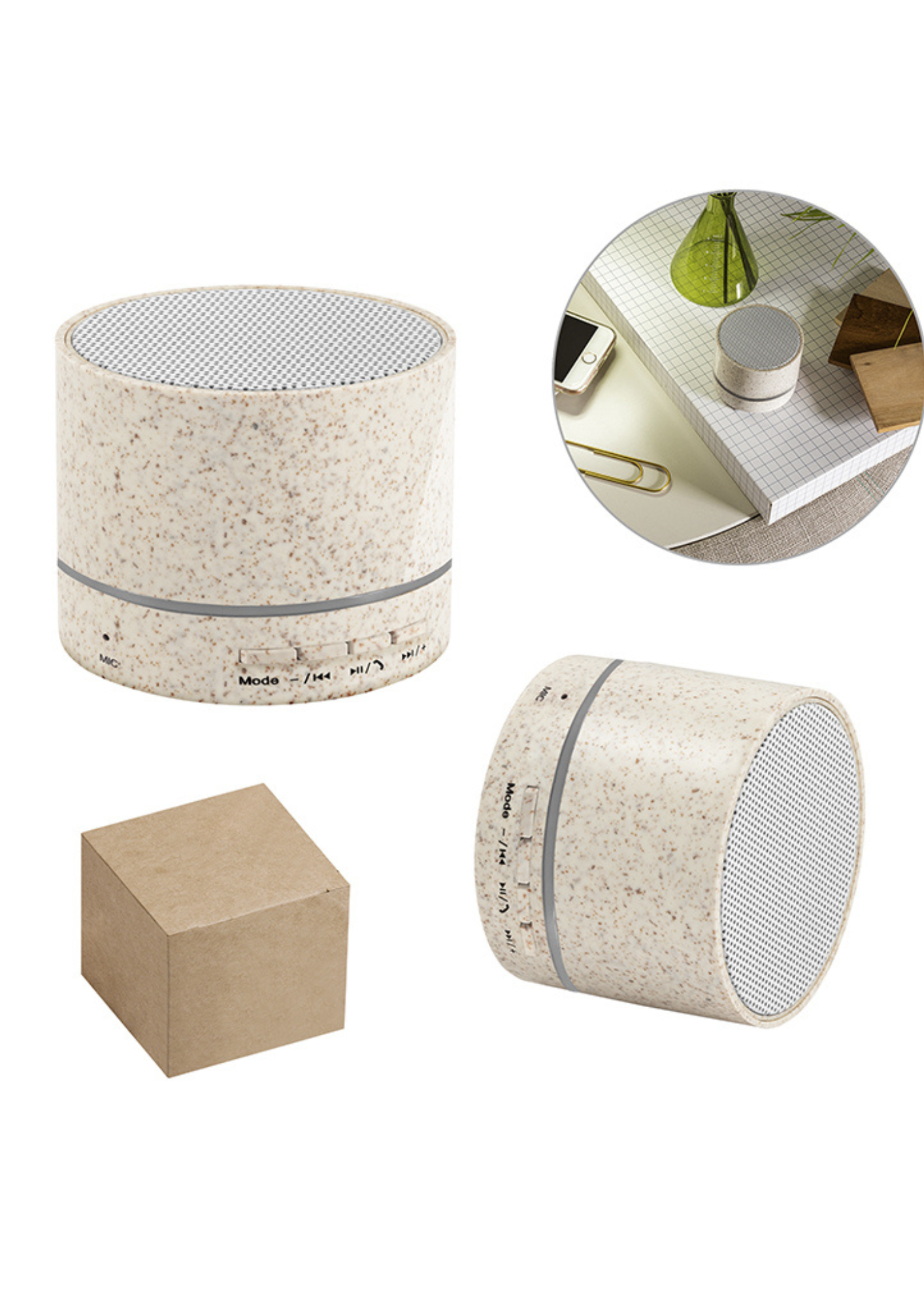 Speaker portátil elaborado con fibra de paja de trigo y ABS reciclado, con potencia de sonido de 3W y batería de 400mAh, lo cual le otorga una autonomía aproximada de 4h30′.